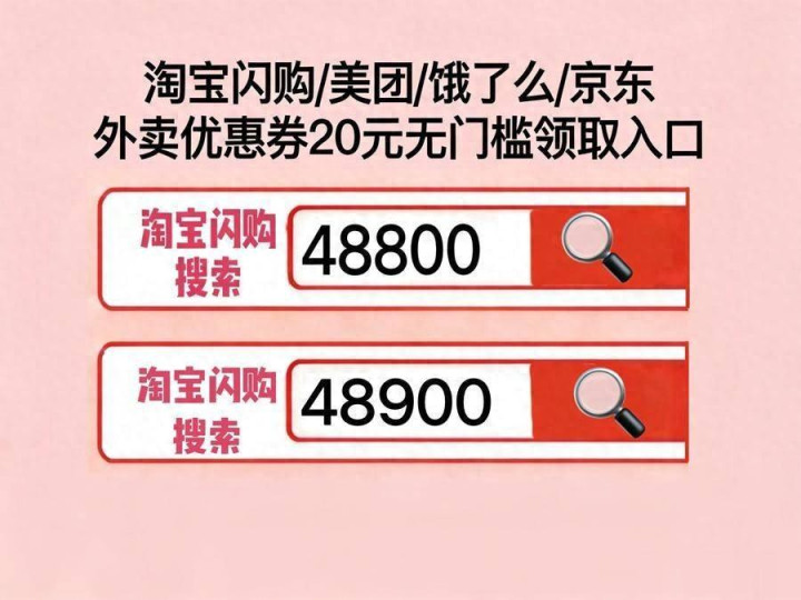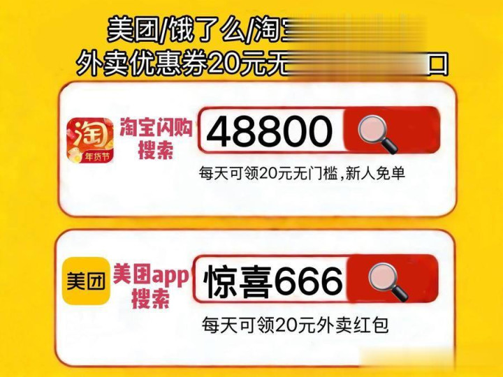 淘宝闪购外卖红包淘宝闪购搜【48800】淘宝闪购外卖优惠券口令免费领取淘宝搜【48900】,好意思团外卖优惠券领取口令是好意思团搜【惊喜666】好意思团神券最新口令