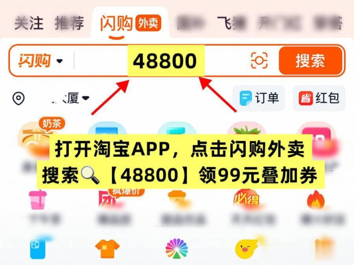淘宝闪购外卖优惠券领取搜口令【48800】和【48900】
