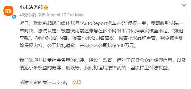 2月24日,小米法务部微博发文称,已收到法院一审判决,认定自媒体账号“AutoReport汽车产经”在多平台传播事实核查不及、“张冠李戴”、显著贬损的本色,侵扰小米公司名誉权,判令该账号运营方删除侵权本色、公开赔礼谈歉,并向小米公司抵偿500万元。