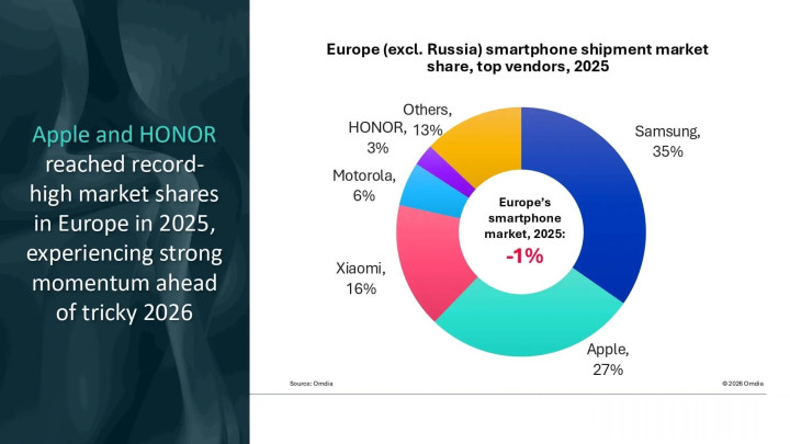 苹果在2025年增长6%,达到3690万台,在欧洲市集份额创下27%的历史新高,OD体育app官网iPhone刷新需求激增,这收货于销耗者和企业的热烈换机诉求。其发达主要由iPhone 16、iPhone 16和iPhone 17的Pro Max版块以及iPhone 16e股东。与专家其他市集比较,iPhone 16e是苹果出货量最高的机型之一,主要收货于它取代了因USB-C行径于2024年底停产的iPhone 14及更早型号。