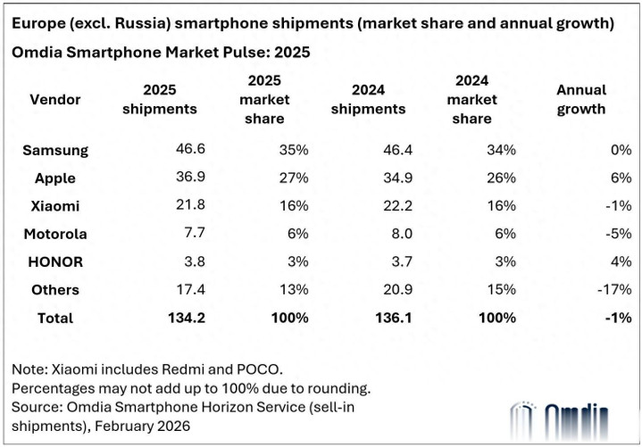 三星已经是欧洲最大的智高东说念主机供应商,出货量略有增长至4660万台。由于Galaxy A0x系列缺席导致2025年上半年发达低迷,借助Galaxy A16和2025年欧洲最畅销机型Galaxy A56的苍劲势头,三星在2025年下半年反弹。