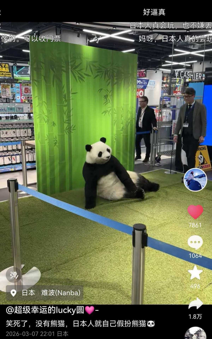 10日上昼,极目新闻记者关连上视频发布者周女士。她说,她前几天在大阪难波的一家商超看到了上述一幕,这个东谈主扮大熊猫还挺像的,摆出各式憨态可掬的姿态,日本莫得熊猫了,靠东谈主假扮熊猫,她以为很搞笑,于是拍摄了很多的画面。