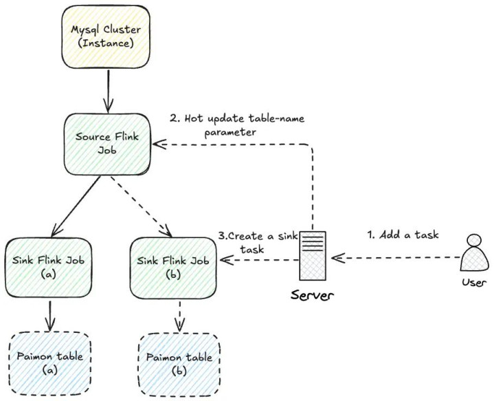 解法:为治理此问题,咱们开发了 table-name 参数的热更新功能, 如图 6 所示。Source 任务仅同步用户明确指定的表。当有新的同步链路加入时,数据平台通过向 JobManager 发送央求,将新表名动态传递给运行中的 Source 算子。算子继承到新参数后,无需重启功课即可出手监听新表。该功能极地面减少了写入 Kafka 的数据量,并幸免了因任务重启给卑劣带来的抖动。