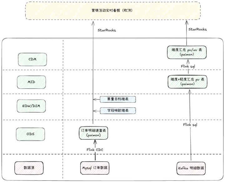 治理有辩论:治理上述问题的关节即是进步全体事迹过程的更新频率,通过更新加速,完了通盘国际业务场地时区不错实时、准确看到事迹统计数据。最终国际业务禁受了近实时湖仓的链路,其全体的链路如下所示: