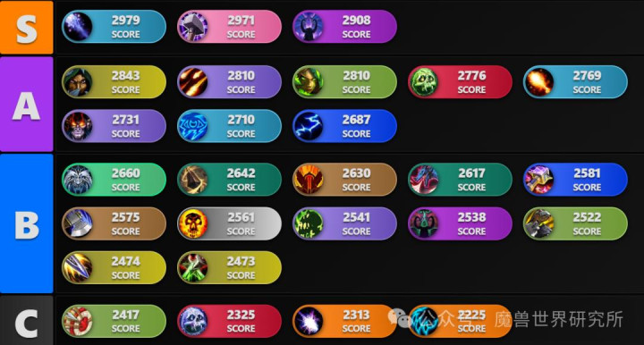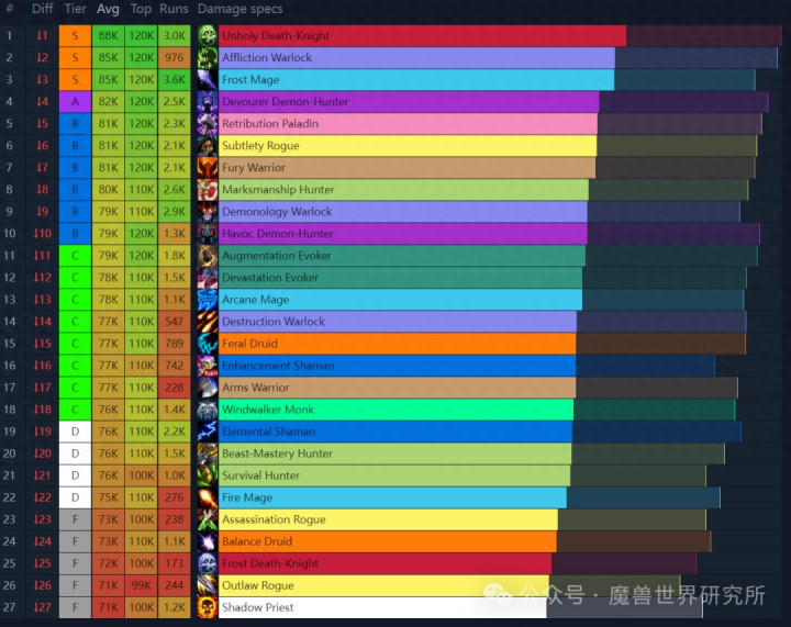 该表格仅以DPS的数值进行名次,F 级并不老是意味着进展很差,仅仅示意该专精 DPS 最低。举例在此名次里为F级的增辉固然伤害不高,然则大秘境的评分却是S。