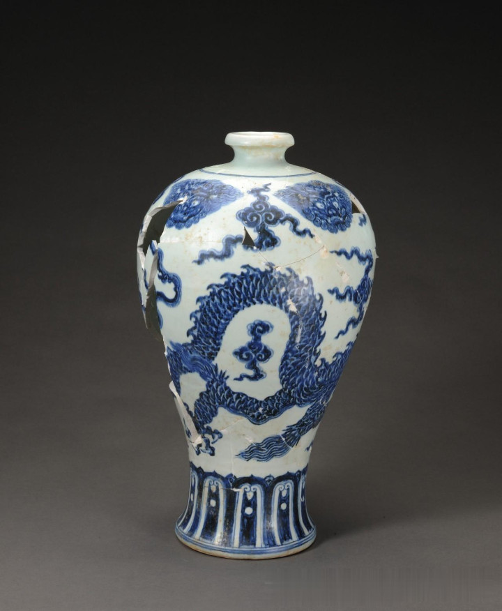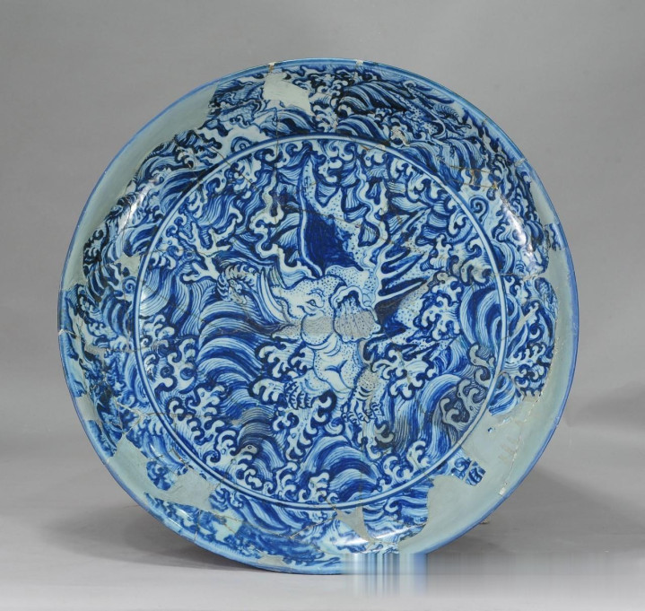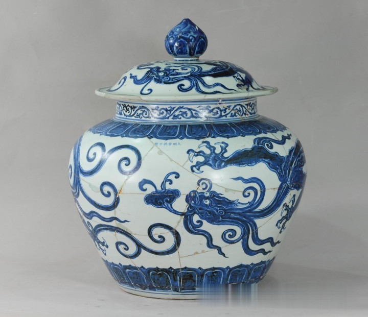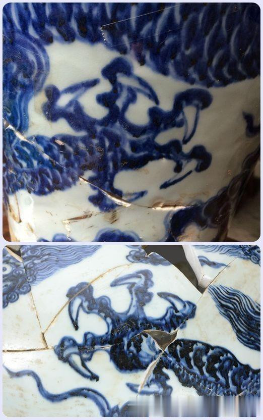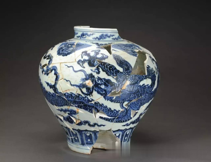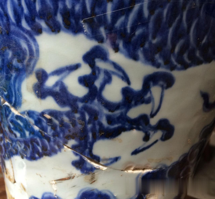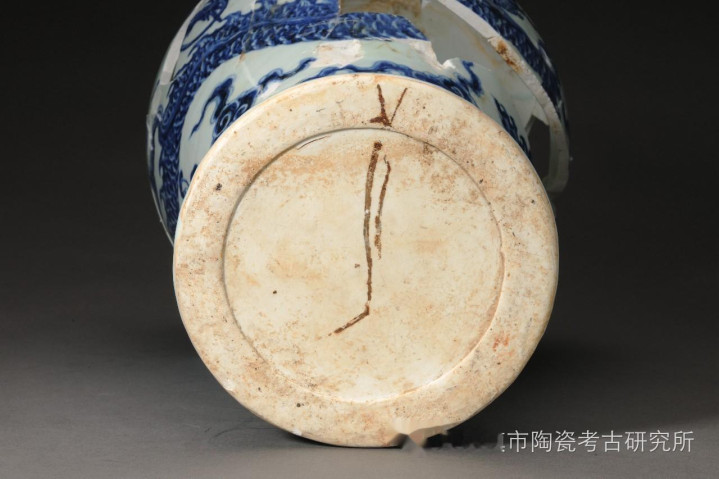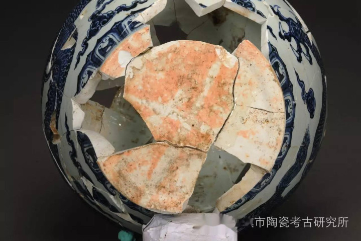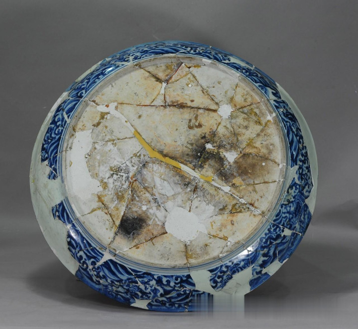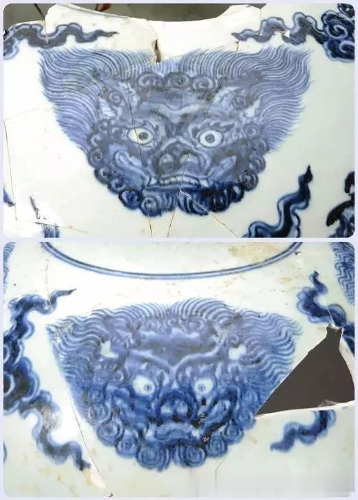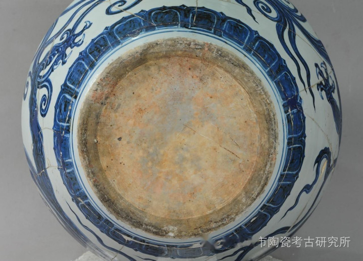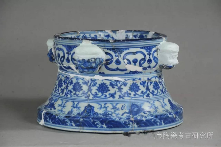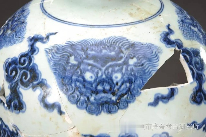 经清洗拼合,这次发掘想象有3件釉色略有判袂的青花辅首龙纹大罐出土,其中设立可见器型者1件。