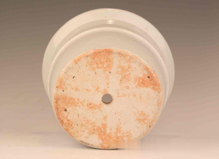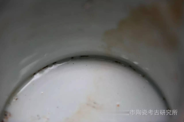 该瓶唇口、溜肩、腹部渐收、足部外撇,圈足宽而平整,底部内陷,砂底光滑近于白色(图五),内壁底部飘摇处轻佻较大,镶接踪迹止境彰着(图六)。