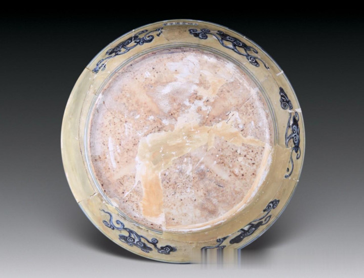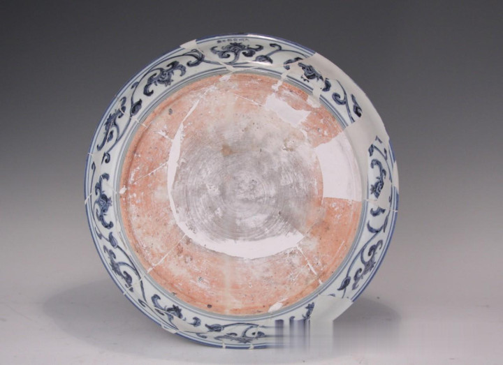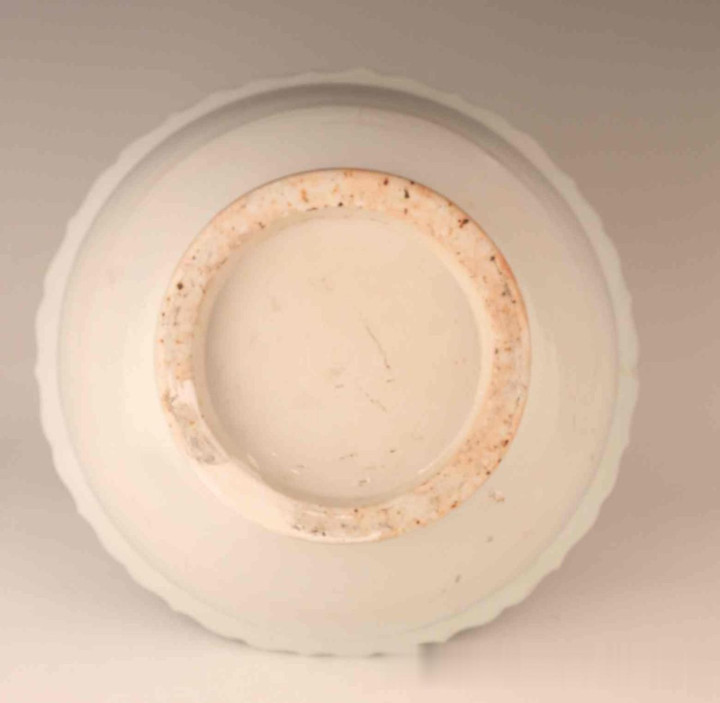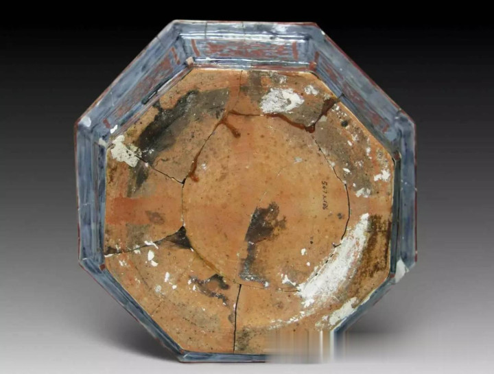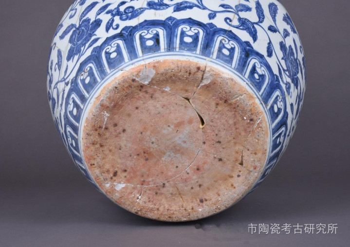 故宫博物院保藏的明洪武大盘和永乐青花大扁壶中,可见此类交叉踪迹。而御窑名胜出土的明代御窑瓷器中,十字交叉痕始见于宣德本事,宣德以后涩底露胎器物减少,该类十字交叉痕实在不见。