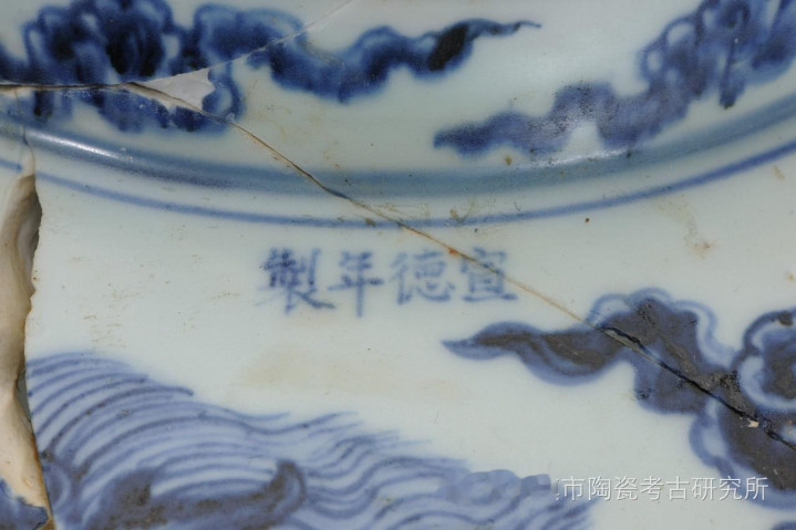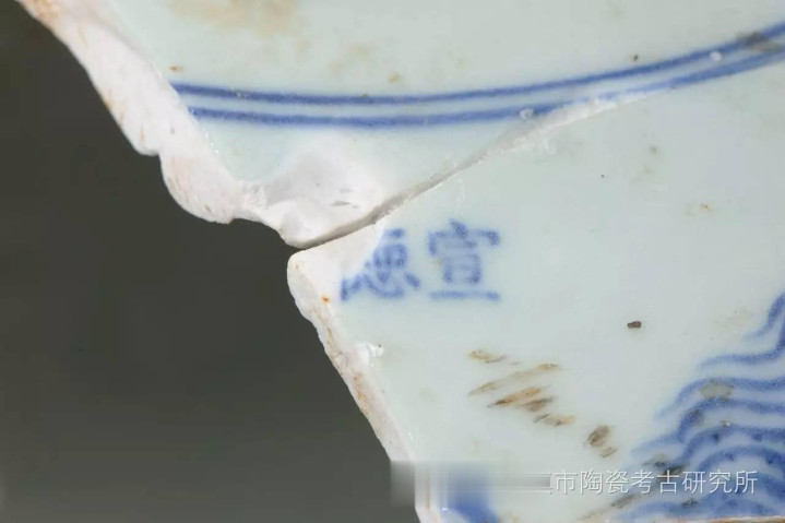 直口处以青花朵云讳饰,罐身龙纹与足部莲瓣与上述龙纹梅瓶访佛,但“宣德年制”四字楷书横款在肩部云头与铺首之间(图十三)。同期出土的3件青花铺首龙纹罐残片,其中两件可见青花款,且款识形态一致。