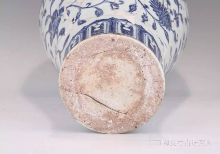 瓷器断然真知堂:1984年珠山御窑名胜宣德地层,出土两件器形、纹饰一致的青花茶菊纹梅瓶(图二十一、二十三),高55.3厘米,口径8.6厘米,底径16.2厘米。一件梅瓶圈足粘砂较严重,涩底内陷,有两谈白色横线呈十字交叉状,但横线旯旮松驰辨识不清(图二十二)。另一件梅瓶底部较平,瓶底微向内凹,局部泛红,底部无十字交叉踪迹(图二十四)。