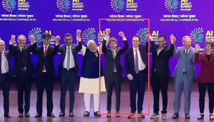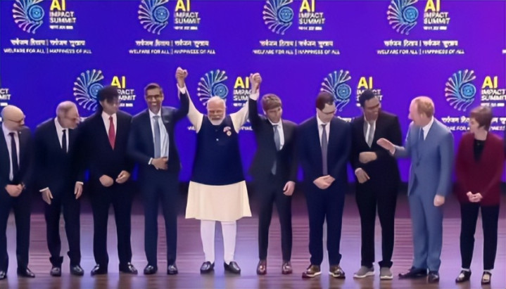 你在上图看到的是前两天在新德里召开的“2026年印度AI影响力峰会”上合影的一幕。