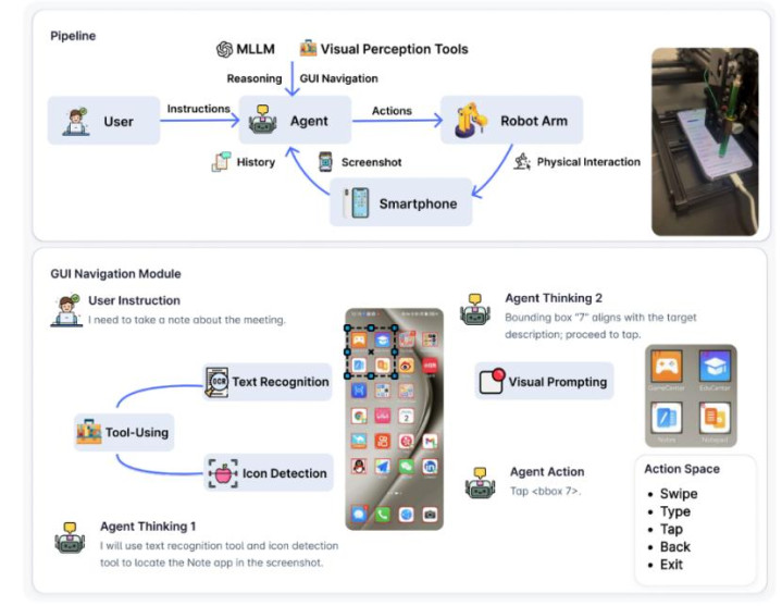 该团队将手机操作问题建模为部分可不雅测马尔可夫决策过程(POMDP),何况将多模态大模子智商装进了机器东谈主里,使用了 GPT-4o、QwenVL 这么的视觉讲话模子,让机器东谈主不仅大致看见屏幕上的图标和笔墨,还能贯通点击某个头像背后的酬酢意图。