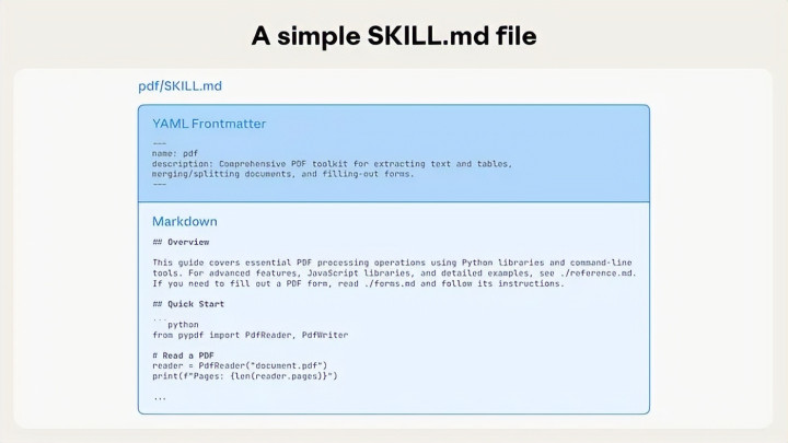 每个妙技皆是一个包含 SKILL.md 文献的文献夹。该文献有两部分:YAML 头部和 markdown 指示。