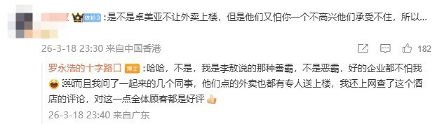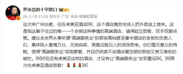3月18日,罗永浩在个东谈主酬酢账号发文称,他到广州出差,住在卓好意思亚旅店,“这个旅店居然会派东谈主把外卖奉上楼来,这是我这辈子住过的独逐一个会作念这种事情的高端旅店,值得起立请安,澳门新浦京双手双脚点赞。”