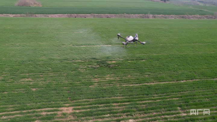 无东说念主机在麦田进行飞防功课(央广网发张旭摄)