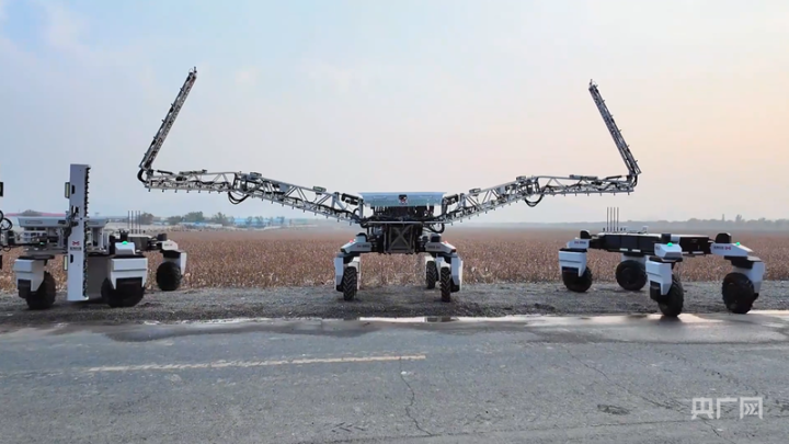 新疆“无东说念主”灵敏农场里的T3000(图中)能源惊东说念主,它的旋转臂最长可伸展至21米(央广网发受访者供图)