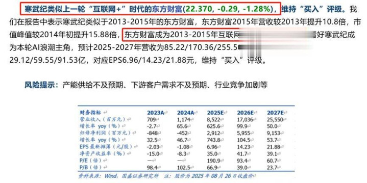 但是这个数据,比拟半年之前国盛证券的预测,然而下调了很大一截。2025年8月底的时候,国盛证券曾发布过一份题为《寒武纪:期间的主角,利润率大超预期》的论说,瞻望本轮AI波澜捏续性大超预期,将显赫带动算力需求擢升,以至评价寒武纪访佛上一轮“互联网+”期间的东方金钱(300059.SZ),并针对2025年到2027年作念出事迹预期是,营收为85.22亿元、170.36亿元、255.50亿元,归母净利润为29.12亿元、59.55亿元、91.53亿元。