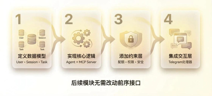 我最先便是去界说这个数据模子,比如说 user、session、task 结构。然后第二步就去竣事这个中枢的逻辑,像 agent 和 mcp server。然后第三步便是添加管制层,便是每个用户它有些许的存储空间。