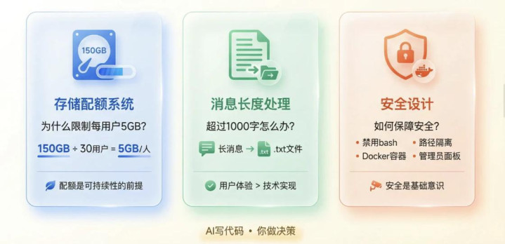 我会这样和 AI 对话:「我想作念一个聊天软件 Bot,用户不错通过它和 Claude Agent 交互。这个 Bot 需要接济多用户,每个用户有寂寞的职责目次和存储配额。你以为应该何如筹办模块?有什么潜在的问题?」