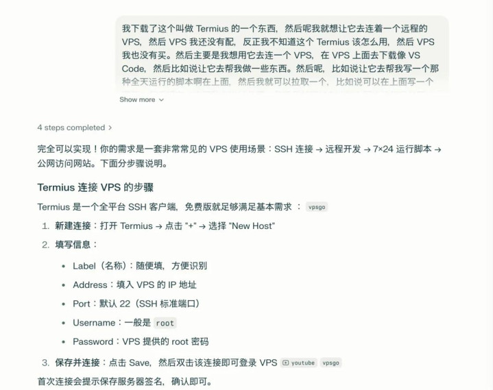 我认为乌有的方式是你教他用 Python 写一个神态,用 Flask API 集成 Claude API 等等。我以为正确的方式:我想在我方的作事器上有一个东西,然后能够随时通过指示,出了问题让他处理文献。