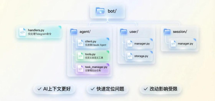 这个端正的公正便是我背面的模块,就无谓背面模块的添加就无谓去改变前边模块的一个接口。是以我加新功能的时候,AI 的高下文就会愈加清晰。而且我一朝出现了 bug,我就知说念我具体是哪一个层面出现的问题,我就平直去针对性地修改这一个层面就好了。