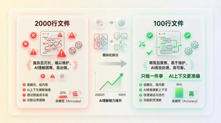 若是一个文献有 2000 行,AI 出错的概率成倍加多。若是一个文献 100 行,只作念一件事: