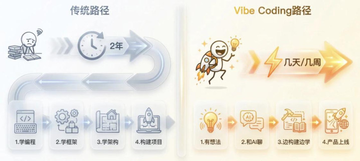 Vibe Coding 的旅途透澈反过来:你先有一个想作念的东西,然后边作念边学。遭遇不懂的,问 AI;卡住了,让 AI 帮你解决。整个这个词过程可能只需要几天致使几个小时,你就能作念出一个不错用的东西。