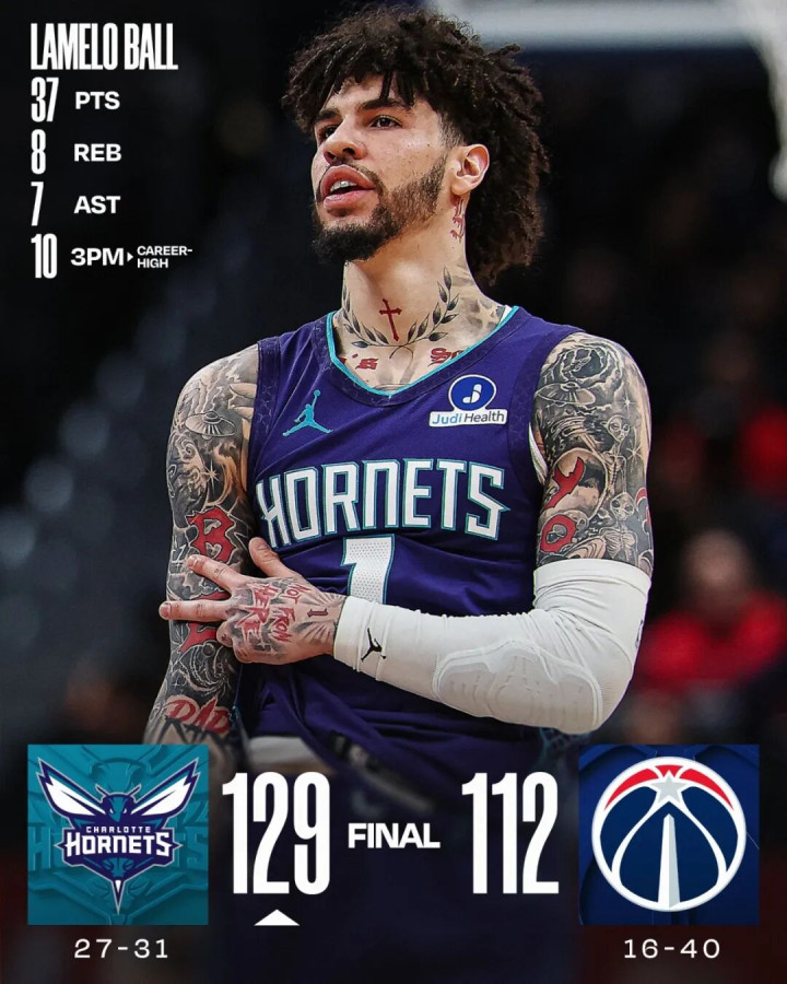 这场比赛,黄蜂方丈球星拉梅洛鲍尔打出了个东谈主赛季最好发扬之一:全场只打了27分钟,投篮20中12,三分15中10,罚球3中3,获得37分8篮板7助攻。