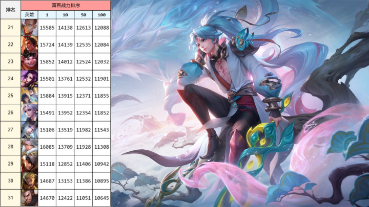 蚩奼和元歌紧随后来,这三个英雄的,加上后边曹操,和本月初时的排名十足一致,关羽的排名朝上靠了一位。