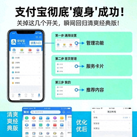 2026年3月最新版支付宝(10.6.0及以上)已全面怒放自界说精简权限,无谓换旧版、无谓卸载重装,关掉几个关键开关,几分钟就能让支付宝从“肥美版”变回炫耀经典器具态,只保留收付款、转账、缴费等中枢功能,告白、推选、小红点、短视频进口一键散失,开动更携带、更省电、更释怀。底下用大口语一步步解说晰,每一步皆亲测有用,随着作念就能告成。