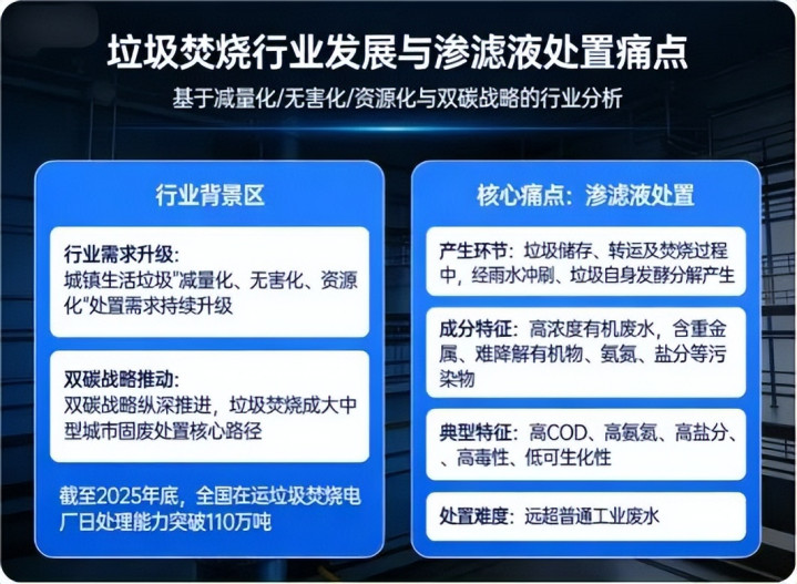 在城镇生涯垃圾“减量化、无害化、资源化”处置需求持续升级,以及双碳计谋纵深鼓励的行业配景下,垃圾毁灭已成为我国大中型城市固废处置的中枢旅途。罢休2025年底,世界在运垃圾毁灭电厂日处理才略已粗心110万吨,畛域化布局的同期,也伴跟着渗滤液处置这一核肉痛点——算作垃圾储存、转运及毁灭过程中,经雨水冲刷、垃圾自身发酵判辨产生的高浓度有机废水,垃圾毁灭渗滤液身分顶点复杂,含有重金属、难降解有机物、氨氮、盐分等多种浑浊物,具有“高COD、高氨氮、高盐分、高毒性、低可生化性”的典型特征,处置难度远超时时工业废水。