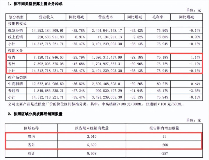 从服从来看,旧年中报省内、省外收入分辩为71.22亿元、73.92亿元,同比分辩大幅下滑25.79%、42.68%,省内推崇要比省外好上一些,不外公司省内跌幅仍然要大于其竞争对手今世缘,后者省内收入62.54亿元,同比下滑6.07%。