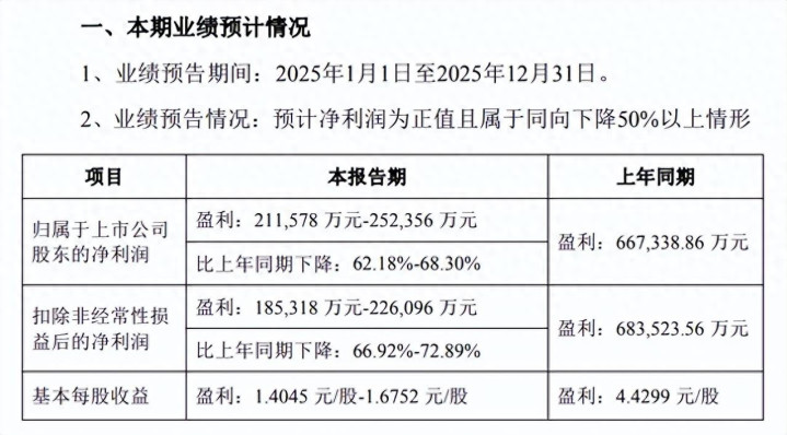 进入2025年,洋河股份事迹并莫得改善,前三季度终局交易收入、归母净利润分辩为180.9亿元、39.75亿元,同比分辩大幅下滑34.26%、53.66%。展望2025年归母净利润、扣非净利润分辩为21.16亿元至25.24亿元、18.53亿元至22.61亿元,同比分辩大幅下滑62.18%至68.3%、66.92%至72.89%。