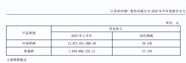 中高级酒、往常酒双双大降。一直以来,中高级酒是洋河股份的主心骨,连年来收入占比多数在85%以上,该产物2024年为243.17亿元,同比减少42.22亿元,降幅14.79%,2025年中报为126.72亿元,同比减少72.89亿元,OD体育app官网降幅36.52%。