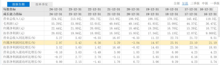 接着是2025年:营收增速1.54%(十年倒数第二),净利润增速-6.58%(十年最惨)。
