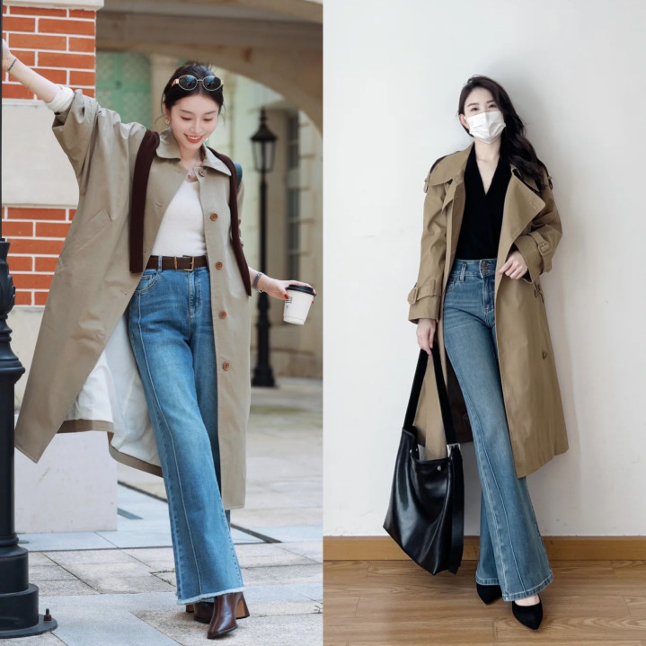卡其色风衣+微喇裤