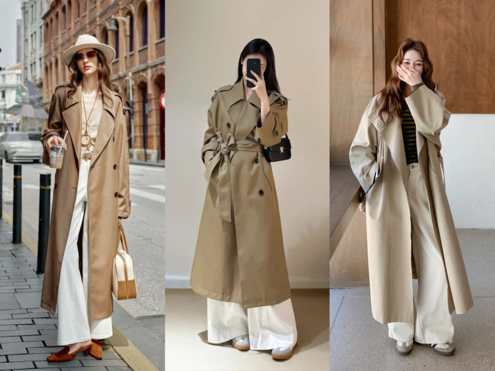 尤其是形体高挑的女生,给与长款卡其色风衣,与白色高腰阔腿裤,从简高等的配色,满满的大女主风。