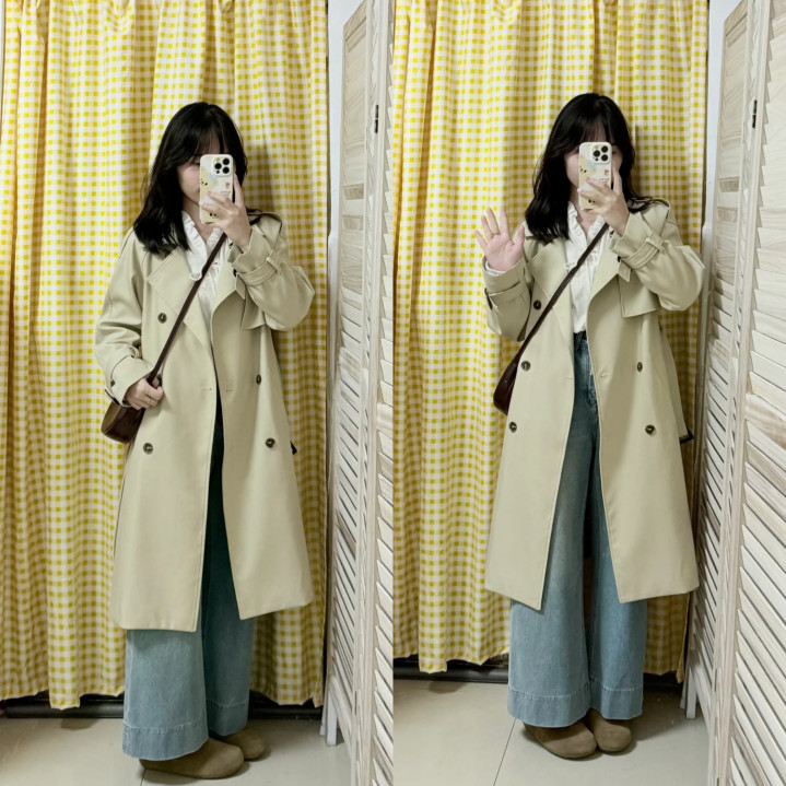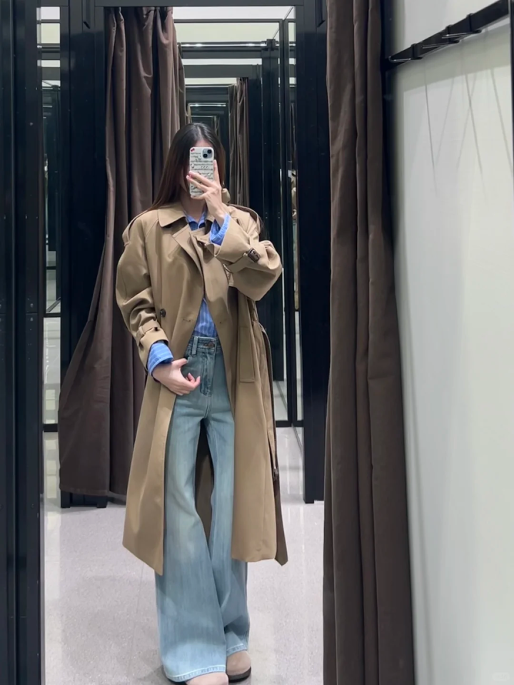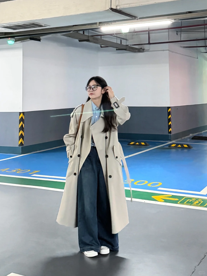 若是是形体高挑的女生,这种大廓形的卡其色风衣与高腰阔腿裤搭配,内搭浅蓝色衬衫,色调搭配额外惬意,宽松惬意的版型,略带慵懒的气质,春季氛围感拉满。
