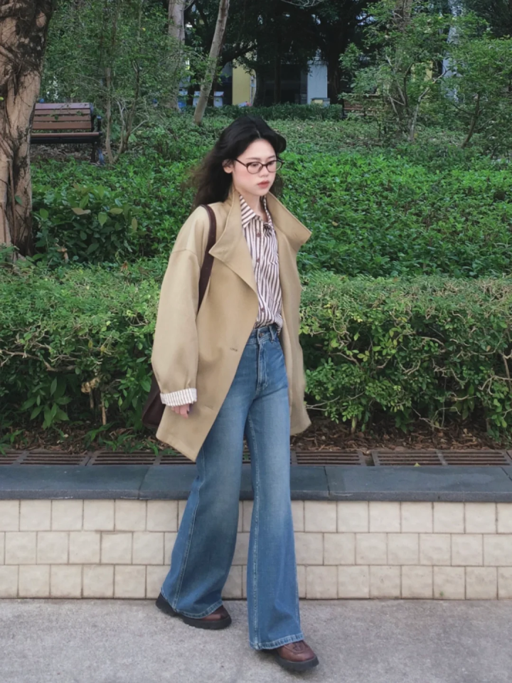 卡其色风衣与微喇裤的组合,内搭衬衫亦然可以的给与,这里保举给与竖条纹衬衫,有很好的修饰形体后果,额外从简利落又干练的通勤风穿搭。