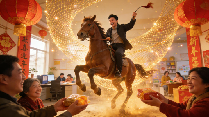 大年头八,瑞马踏春,开工吉时启新程。“八”含八方来财之吉,如全国织就的福网,收纳四方祯祥——既寄寓物资丰饶的期盼,更藏着精神充盈的向往。