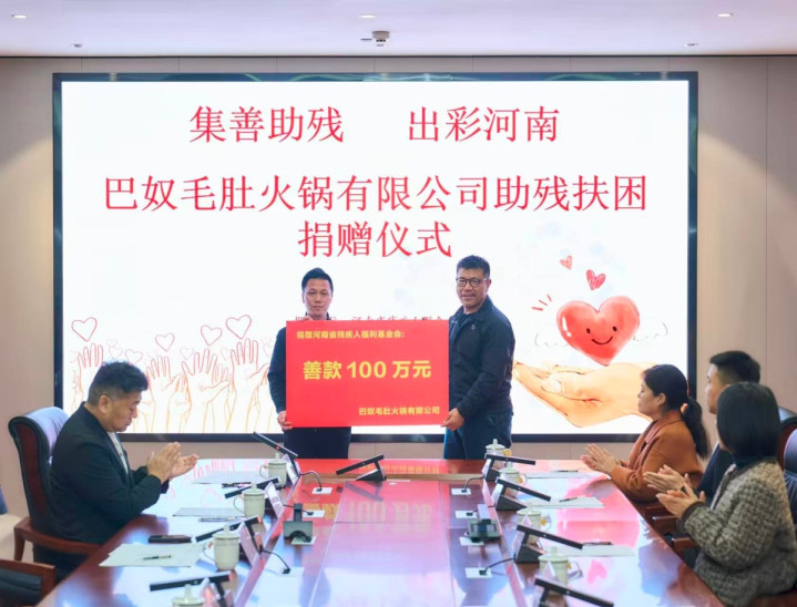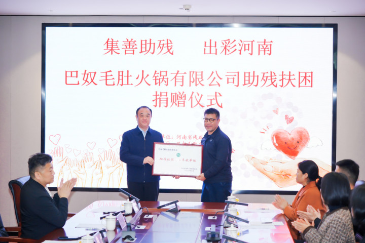 3月10日上昼,河南省残疾东谈主福利基金会在郑州举办“集善助残出彩河南”——巴奴毛肚暖锅有限公司助残扶困捐赠庆典,庆典上,爱心企业向省残疾东谈主福利基金会捐赠100万元善款,用于关爱听障儿童。