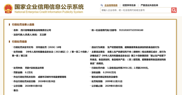 国度企业信用信息公示系统知道,本年2月,四川省蜀福香食物有限背负公司,OD体育app官网因分娩方案超限制、超限量使用食物添加剂的食物的算作,被成齐市邛崃市阛阓监督处治局充公积恶所得2950.2元,并罚金2000元。主要积恶事实知道,该公司分娩的原切风干肉(麻辣味)检出诱导红身分,涉嫌违背食物安全法。